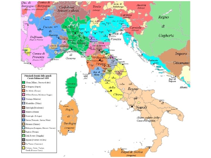 La discesa di Carlo VIII in Italia Interesse per Milano Firenze Per il regno di Napoli Lo rivendicava in quanto erede degli Angiò L’imprudente Ludovico il Moro ne aveva richiesto l’intervento +1498 Il debole Piero dei Medici gli consegnò le fortezze di Pietrasanta, Sarzana, Porto di Livorno, Pisa (che si ribellò) Massimiliano d’Asburgo promosse una coalizione: Spagna, Venezia, Stato Pontificio, Milano Carlo VIII sconfitto a Fornovo 1495