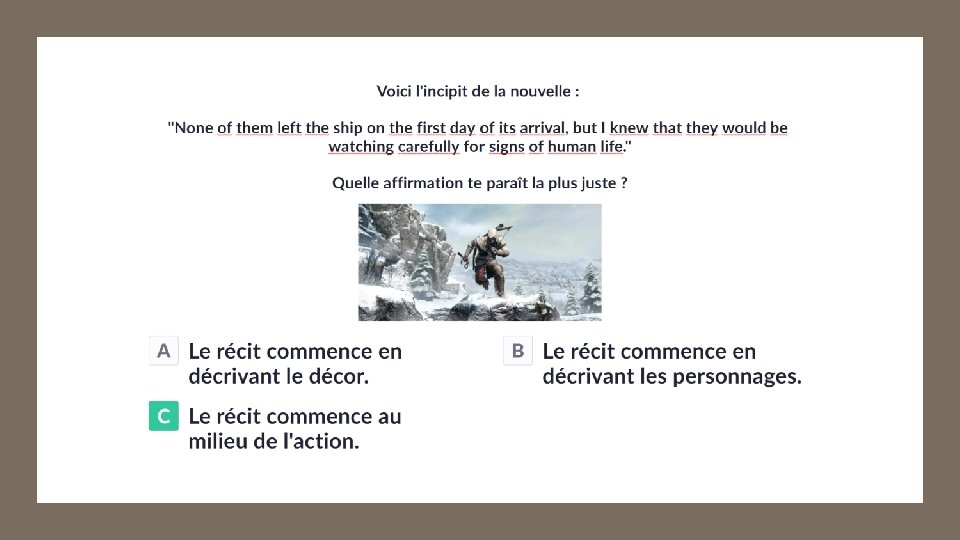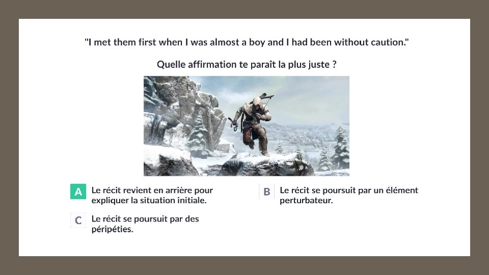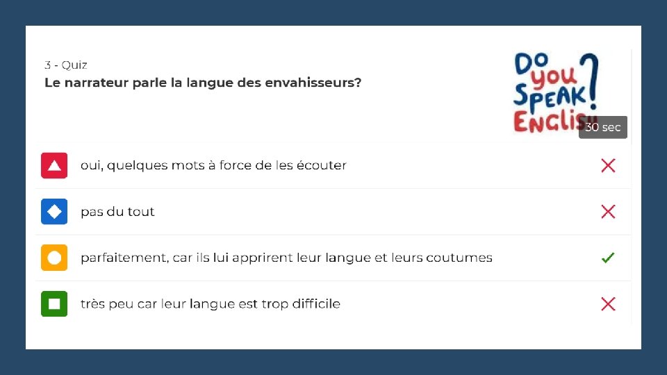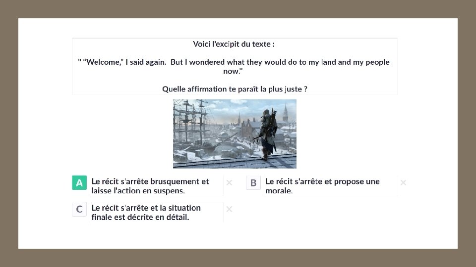 Types de questionnaires et modalités à réfléchir avec les enseignants Construire le questionnaire en fonction de l’objectif Faire réfléchir sur l’ensemble du document Faire réfléchir à partir de citations/d’extraits Réfléchir à des questions sur l’explicite et les implicites du texte Pas de questions de détail / anecdotiques