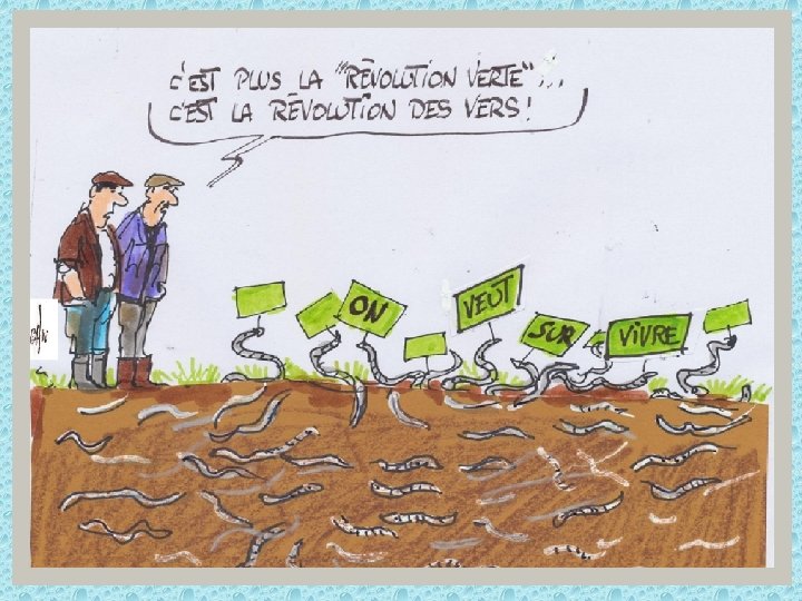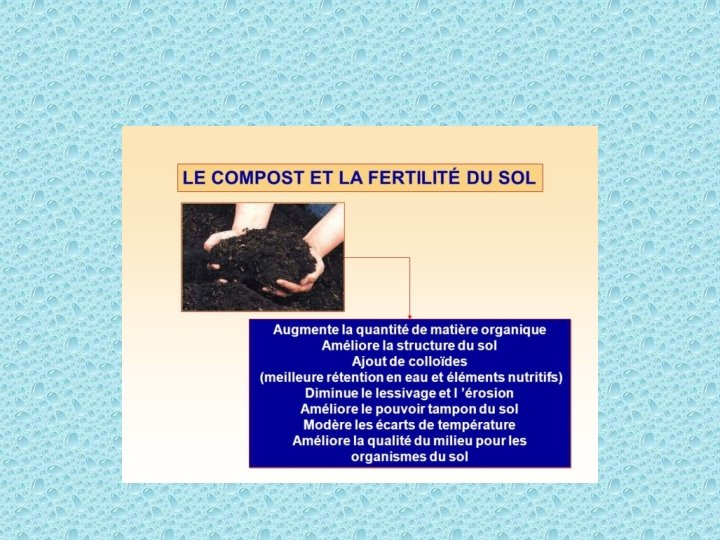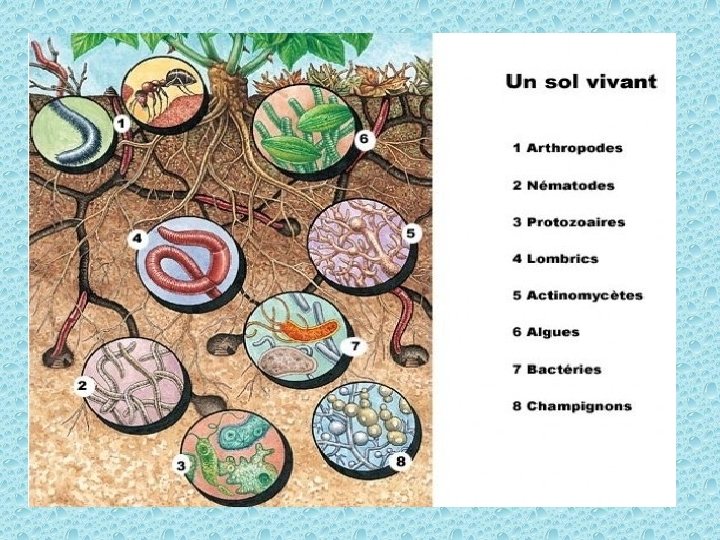 Quelques conseils • Ne pas labourer la terre limite le lessivage. • Si le sol est trop souvent retourné, les micro-organismes des profondeurs se retrouvent en surface et vice-versa. • Il faut considérer le sol non plus comme un vulgaire support mais comme un écosythème a part entière. • Les bio stimulants naturels, les amendements apportés au bon moment et en quantité réfléchie, la plantation de haies , les cultures biologiques relancent l’activité biologique du sol.