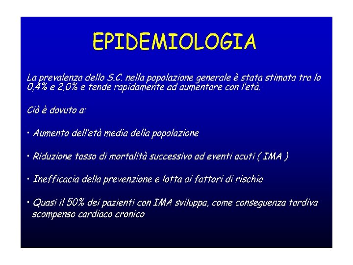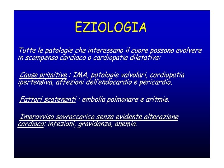 Eziologia 1. Cause di origine miocardica • malattia coronarica ed infarto miocardico • miocardite e cardiomiopatie. 2. Cause emodinamiche • sovraccarico di volume del cuore • sovraccarico di pressione del cuore, ipertensione arteriosa o polmonare, vizi con stenosi valvolare.