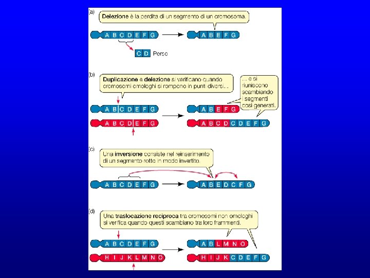 Mutazioni nella struttura dei cromosomi Esistono 4 tipi principali di mutazione della struttura dei cromosomi • delezione • duplicazione • inversione • traslocazione