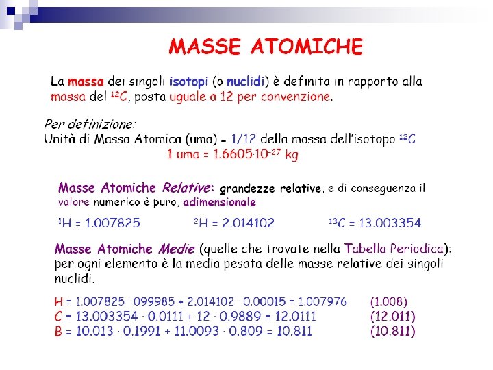 UNITA DI MASSA ATOMICA massa protone 1, 673 · 10 -24 g massa neutrone 1, 602 · 10 -24 g 1 u. m. a. = 1, 66 x 10 -24 g Si assume come standard l’atomo di carbonio che possiede 6 protoni e 6 neutroni (12 nucleoni) L’unità di massa atomica (u. m. a. ) è pari ad un dodicesimo della massa di un atomo di 12 C Per definizione tale atomo di carbonio possiede una massa esatta 12 u. m. a.