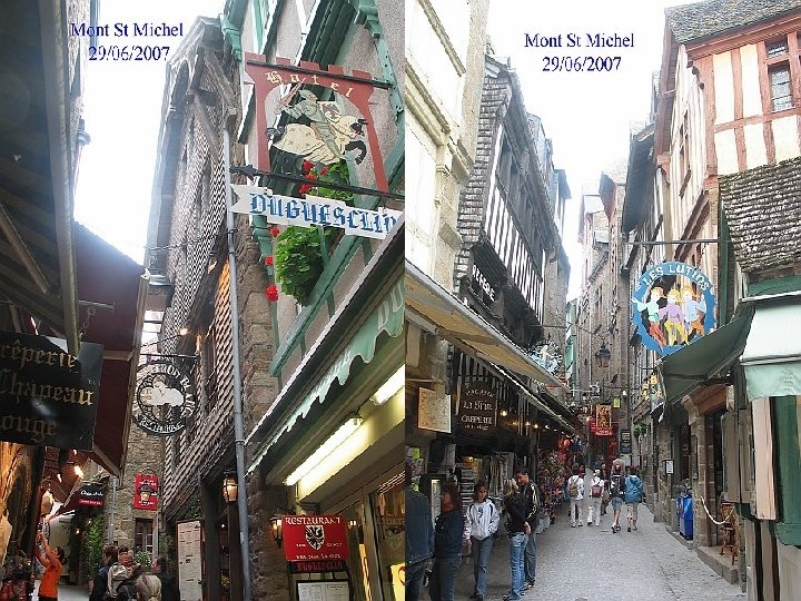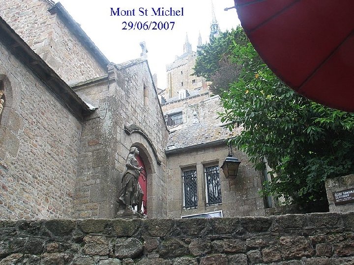 L’entrée dans le mont se fait par la plus ancienne des portes : La porte du roi, construite en 1435. Elle était défendue par un pont-levis doublé d’un fossé reconstruit à l’identique en 1992. La porte est surmontée du Logis, bâtiment destiné au gardien chargé de la surveillance de l’entrée. Elle est suivie par deux autres portes de renfort, la porte du boulevard et enfin, la porte de l’avancée près de laquelle sont exposées deux bombardes laissées par les anglais après leur défaite en 1434. Ces deux canons sont aussi nommés les michelettes. Après cette série de portes rendant l’accès au mont quasiment infranchissable, commence La Grande Rue (l’unique rue du mont). Cette longue rue ascendante traverse le village et achemine vers une longue série de marches (le Grand Degré Extérieur) en direction de l’abbaye. Dans sa dernière portion, cette rue dessert une petite église paroissiale dédiée à Saint-Pierre, avec la particularité d’être accolée à une tour. L’église Saint-Pierre date des XV et XVIe siècles. L’attrait réside dans son mobilier de qualité, comme ses fonts baptismaux du XIIIe siècle et ses statues du XVe. L’autel, aménagé dans la tour, fut réalisé par un orfèvre parisien (Chertier) en 1873. Il est agrémenté de pierreries et recouvert de lames d’argent. Créée en 1877, la belle statue de Saint. Michel entièrement lamée d’argent demeure aussi dans cette petite église où se perpétue désormais son culte.