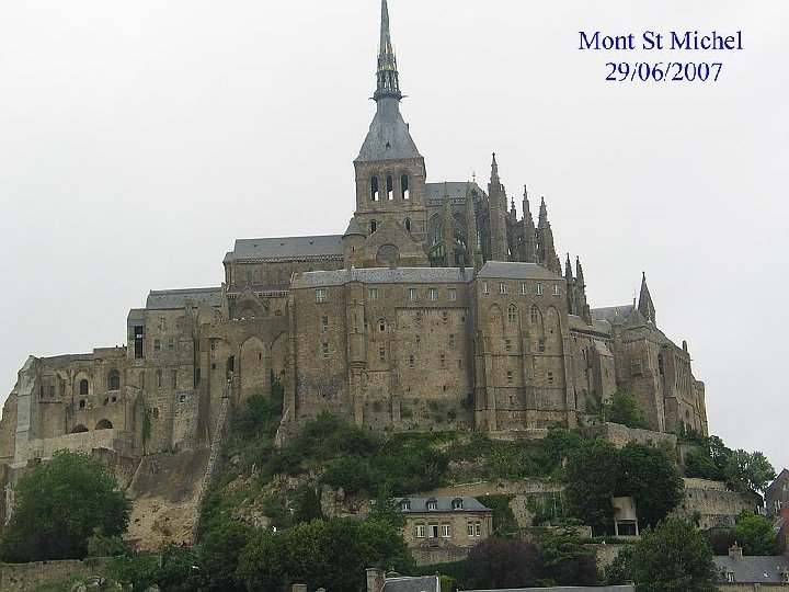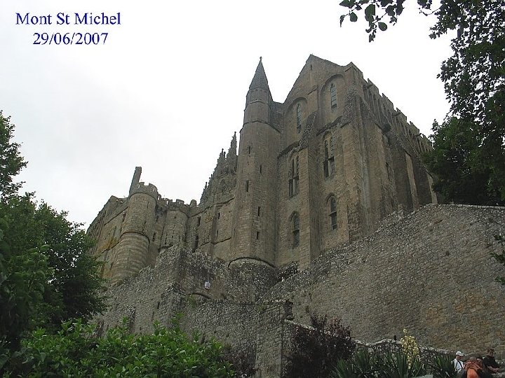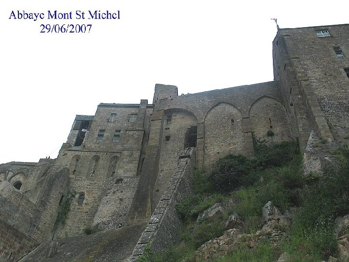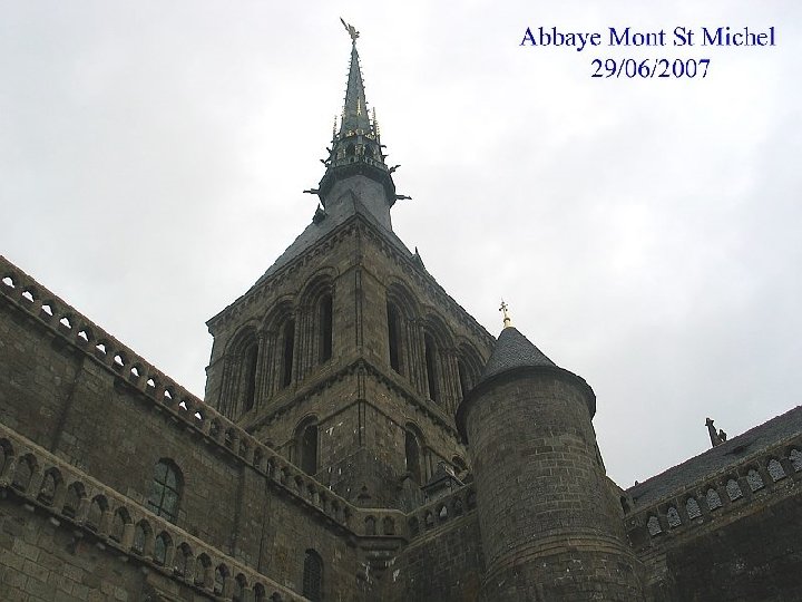 Le Mont Saint-Michel : vue du côté Sud-Est (le côté que le visiteur voit en arrivant au site) On peut remarquer sur cette image du haut en bas : la flèche de l'église abbatiale puis le clocher. Ensuite l'église abbatiale de style roman avec le chœur de style gothique, ensuite les puissants contreforts qui ont été édifiés à l'extérieur de l'abbaye pour soutenir l'ensemble des structures bâties à flanc de rocher du côté Sud-Est ; enfin les habitations et une partie des remparts.