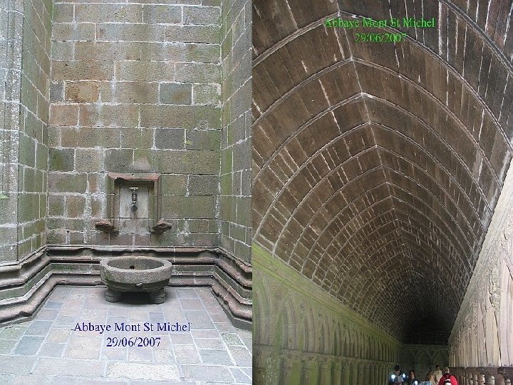 l’ossuaire, édifié en 1060, présente un enchevêtrement de piliers sur voûtes de différentes hauteurs, avec des entresols à certains endroits. Cela laisse à penser que ce lieu faisait partie d’un ensemble plus vaste n’ayant pas subsisté. En 1820, une grande roue monte-charge y fut installée afin d’acheminer la nourriture aux prisonniers de l’abbaye. La roue et le poulain (XIXe siècle) : La roue. Ancien ossuaire (lieu où sont conservés des ossements humains) où l'administration pénitentiaire installa au XIXe siècle une grande roue. Des prisonniers qui marchaient à l'intérieur à la manière d'écureuils, la faisaient tourner. Un chariot pouvait ainsi être hissé le long d'un poulain, véritable échelle de pierre, inclinée le long du rocher. Au Moyen -Age, une roue identique servait sur le versant nord à approvisionner le Cellier.