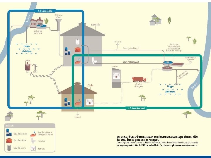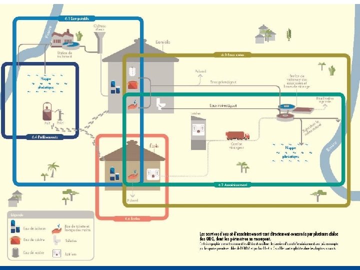 Cible 6. 2 : détail de la cible assainissement D’ici à 2030, assurer … l’accès de tous dans des conditions équitables à des services d’assainisse ment et d’hygiène Implique des installations près du domicile pouvant être atteintes et utilisées facilement en cas de besoin Pouvant être utilisés par des hommes, des femmes, des filles et garçons de tous âges, y compris des personnes à mobilité réduite Implique de réduire et d’éliminer progressivement les inégalités entre les sous-groupes de la population L’assainissement est l’offre d’installations et de services destinés à gérer et à éliminer l’urine et les matières fécales d’origine humaine L’hygiène représente les conditions et pratiques qui contribuent à la préservation de la santé et per¬mettent d’éviter la propagation de maladies, notamment le lavage des mains, la gestion de l’hygiène menstruelle et l’hygiène alimentaire