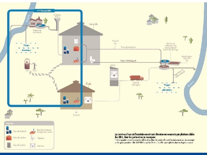 Cible 6. 1 : détail de la cible eau potable D’ici à 2030, assurer … l’accès universel et équitable à l’eau potable à un coût Interprétation Implique la disponibilité à proximité du domicile d’un point d’eau fiable et approvisionné en quantité suffisante pour couvrir les besoins domestiques. S’applique à tous les contextes, y compris le domicile, les établissements scolaires, les centres de santé, les lieux de travail et les espaces publics. Adapté à l’utilisation par les hommes, les femmes, les filles et les garçons de tous âges, y compris les personnes en situation de handicap. Implique la réduction et l’élimination progressive des inégalités entre les sous-groupes démographiques. Eau utilisée comme boisson, pour la préparation des aliments et des repas, et pour l’hygiène personnelle. L’eau potable est constamment exempte de tout pathogène et elle ne présente pas des niveaux élevés de contamination par des substances toxiques. Le paiement des services ne représente pas un obstacle à l’accès à l’eau ou n’empêche pas les individus de répondre à d’autres besoins fondamentaux.