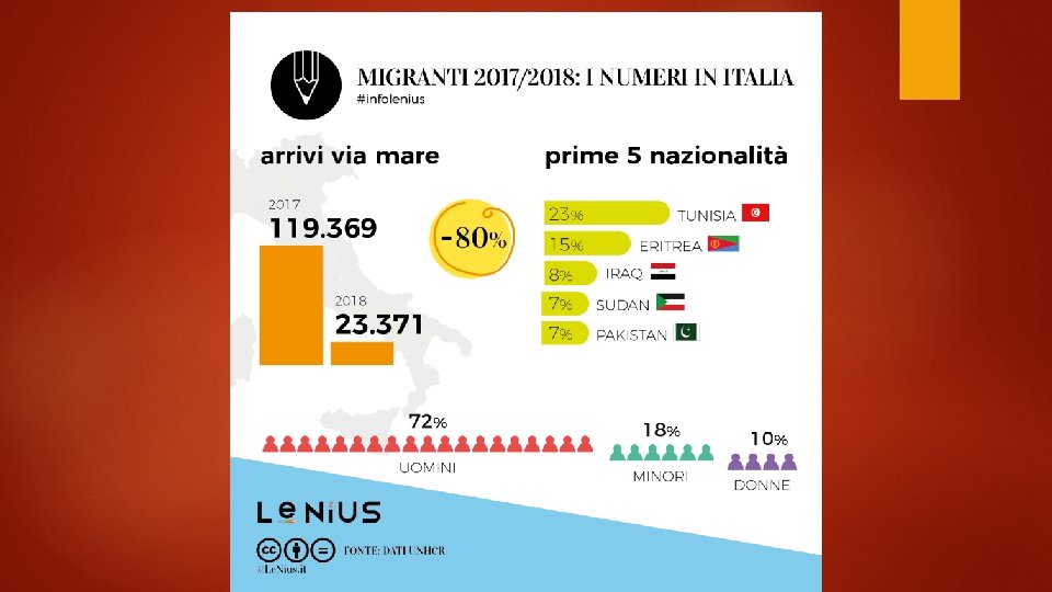 Rotte migratorie, viaggi e viaggiatori I DATI SBARCHI Secondo i dati Unhcr, tra il 1 gennaio e il 28 febbraio 2018 sono sbarcate in Italia 5. 258 persone. Nei primi due mesi del 2017 erano arrivate in Italia 13. 439 persone, il calo è quindi del 61%. PAESI DI PROVENIENZA Tra i paesi di provenienza (dato aggiornato al 31 gennaio 2018) il più rappresentato è l’Eritrea (28% delle persone arrivate) seguito da Tunisia (15%), Pakistan (7%) e, sotto il 5%, Nigeria, Libia, Costa d’Avorio, Senegal. DOVE ARRIVANO La gran parte dei migranti sbarca nei porti della Sicilia (il 92%), la restante parte approda tra Calabria e Sardegna. Il 67% delle persone arrivate sulle coste italiane (dato aggiornato al 31 gennaio 2018) è di sesso maschile, le donne sono il 14%, i minori il 19% – in gran parte non accompagnati.