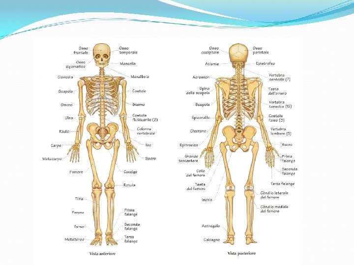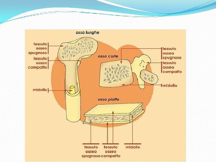 Composizione dello scheletro Lo scheletro umano è formato da 206 ossa, con forma e funzione diverse. A grandi linee le ossa possono essere classificate in tre gruppi: Lunghe: sono caratterizzate dalla presenza, nella diafisi, del midollo osseo, fondamentale nella produzione dei globuli rossi del sangue; Piatte: sono larghe e sottili con spessore ridotto, il tessuto spugnoso è contenuto nello spessore dell’osso tra due strati di osso compatto, come un sandwich; Corte: le tre dimensioni sono simili, all’interno è contenuto molto midollo osseo, rivestito da un sottile strato di tessuto osseo compatto.
