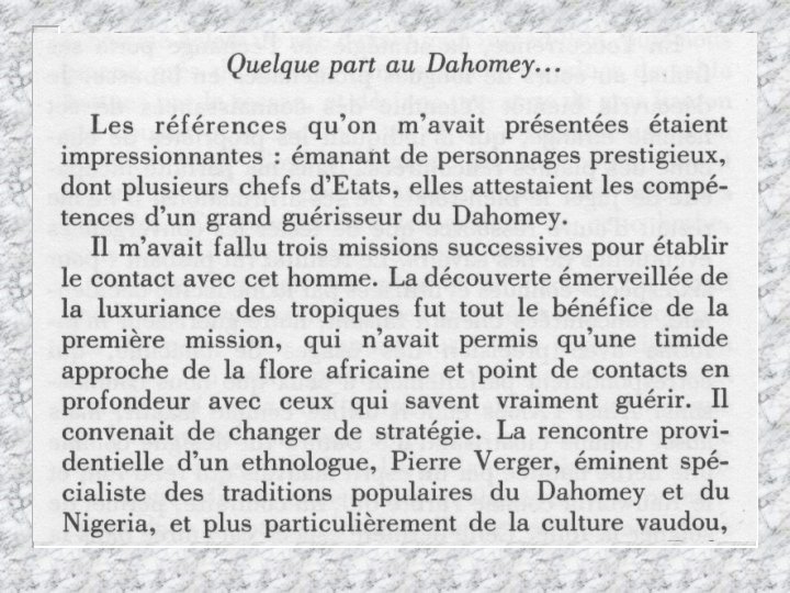 De l’exploitation des Connaissances Universelles Il est regrettable que ces connaissances n exploitées, complétées, améliorées n par les grands laboratoires n soient ensuite couvertes par des brevets n d’exploitations commerciales au détriment total des populations du tiers monde. n La Science et les connaissances universelles n qu’elle développe doivent être déclarées n Patrimoine de l’Humanité. n n Paul C. HOUESSOU , ( Cotonou, Août 1997).
