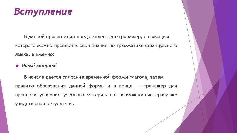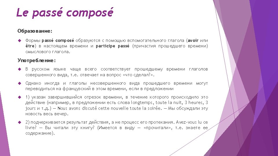 Le passé composé со вспомогательным глаголом «être» спрягаются следующие глаголы: Aller, arrivent, venir, partir, entrer, sortir, rester, monter, descendre, tomber, naitre, mourir Возвратные глаголы Verbes pronominaux