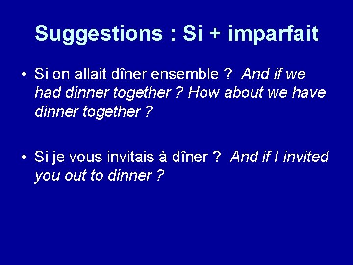 Suggestions : Si + imparfait • Si on allait dîner ensemble ? And if we had dinner together ? How about we have dinner together ? • Si je vous invitais à dîner ? And if I invited you out to dinner ?