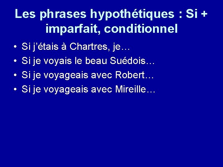 Les phrases hypothétiques : Si + imparfait, conditionnel • • Si j’étais à Chartres, je… Si je voyais le beau Suédois… Si je voyageais avec Robert… Si je voyageais avec Mireille…
