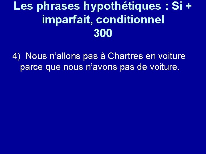 Les phrases hypothétiques : Si + imparfait, conditionnel 300 4) Nous n’allons pas à Chartres en voiture parce que nous n’avons pas de voiture.
