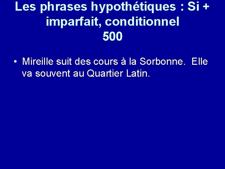 Les phrases hypothétiques : Si + imparfait, conditionnel 500 • Mireille suit des cours à la Sorbonne. Elle va souvent au Quartier Latin.