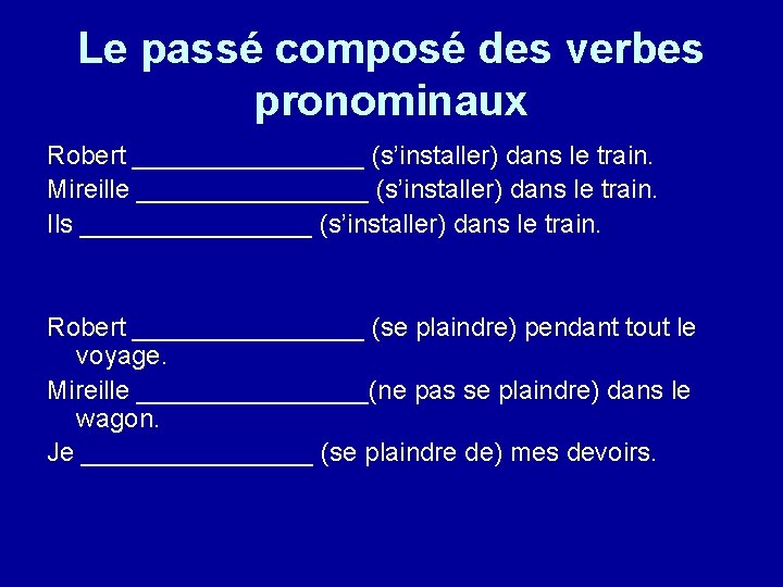 Le passé composé des verbes pronominaux Robert ________ (s’installer) dans le train. Mireille ________ (s’installer) dans le train. Ils ________ (s’installer) dans le train. Robert ________ (se plaindre) pendant tout le voyage. Mireille ________(ne pas se plaindre) dans le wagon. Je ________ (se plaindre de) mes devoirs.
