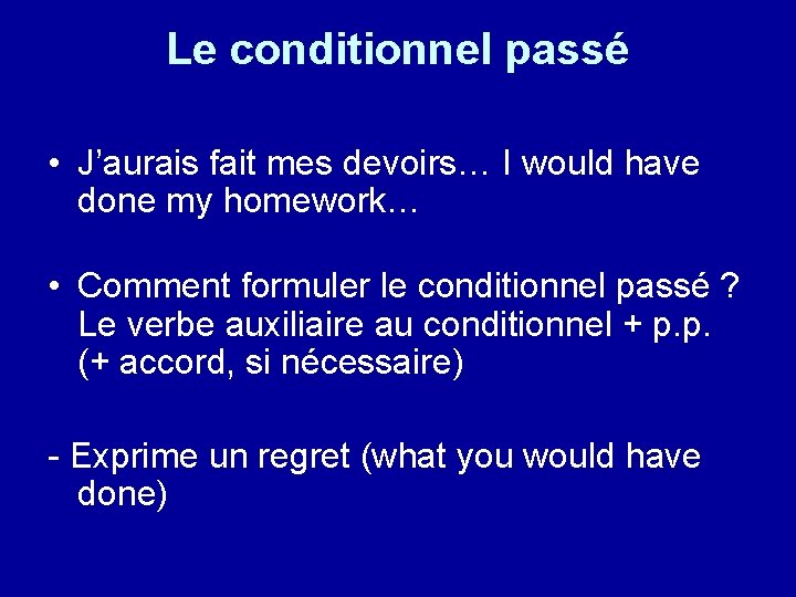 Le conditionnel passé • J’aurais fait mes devoirs… I would have done my homework… • Comment formuler le conditionnel passé ? Le verbe auxiliaire au conditionnel + p. p. (+ accord, si nécessaire) - Exprime un regret (what you would have done)
