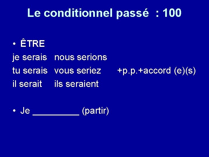 Le conditionnel passé : 100 • ÊTRE je serais nous serions tu serais vous seriez il serait ils seraient • Je _____ (partir) +p. p. +accord (e)(s)