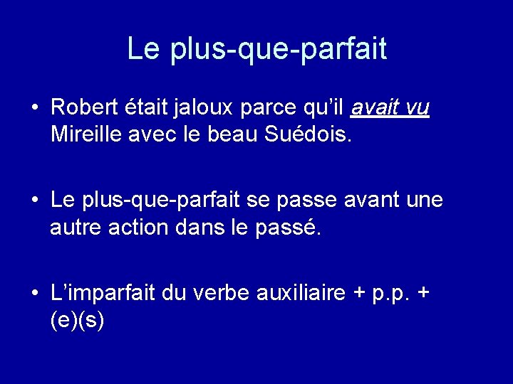 Le plus-que-parfait • Robert était jaloux parce qu’il avait vu Mireille avec le beau Suédois. • Le plus-que-parfait se passe avant une autre action dans le passé. • L’imparfait du verbe auxiliaire + p. p. + (e)(s)