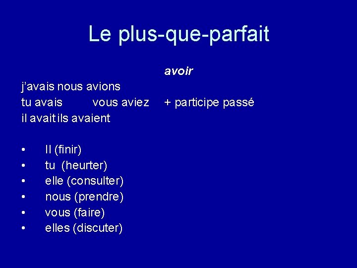 Le plus-que-parfait avoir j’avais nous avions tu avais vous aviez + participe passé il avait ils avaient • • • Il (finir) tu (heurter) elle (consulter) nous (prendre) vous (faire) elles (discuter)