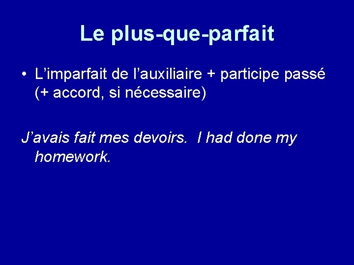 Le plus-que-parfait • L’imparfait de l’auxiliaire + participe passé (+ accord, si nécessaire) J’avais fait mes devoirs. I had done my homework.