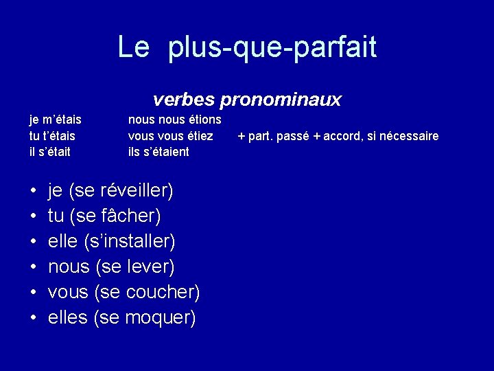 Le plus-que-parfait verbes pronominaux je m’étais tu t’étais il s’était • • • nous étions vous étiez + part. passé + accord, si nécessaire ils s’étaient je (se réveiller) tu (se fâcher) elle (s’installer) nous (se lever) vous (se coucher) elles (se moquer)