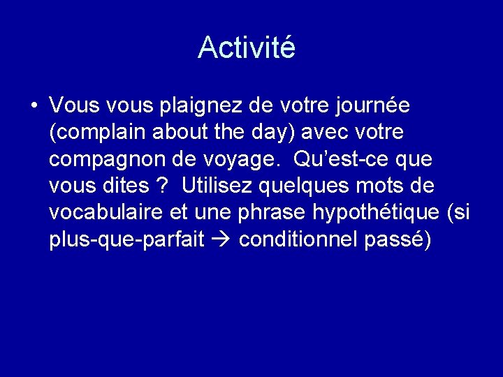 Activité • Vous vous plaignez de votre journée (complain about the day) avec votre compagnon de voyage. Qu’est-ce que vous dites ? Utilisez quelques mots de vocabulaire et une phrase hypothétique (si plus-que-parfait conditionnel passé)