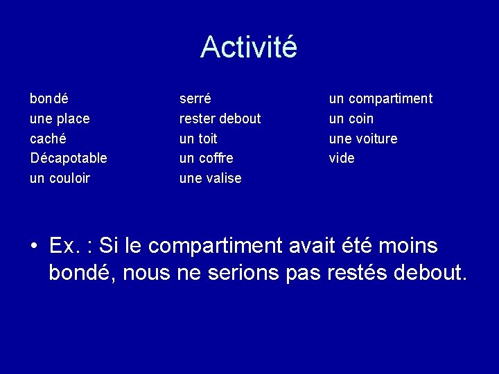 Activité bondé une place caché Décapotable un couloir serré rester debout un toit un coffre une valise un compartiment un coin une voiture vide • Ex. : Si le compartiment avait été moins bondé, nous ne serions pas restés debout.