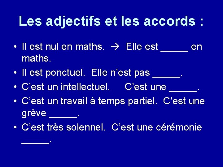 Les adjectifs et les accords : • Il est nul en maths. Elle est _____ en maths. • Il est ponctuel. Elle n’est pas _____. • C’est un intellectuel. C’est une _____. • C’est un travail à temps partiel. C’est une grève _____. • C’est très solennel. C’est une cérémonie _____.