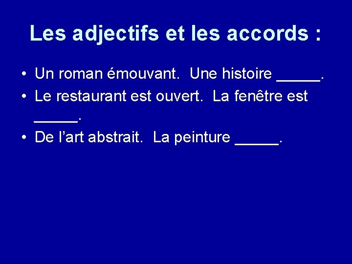 Les adjectifs et les accords : • Un roman émouvant. Une histoire _____. • Le restaurant est ouvert. La fenêtre est _____. • De l’art abstrait. La peinture _____.
