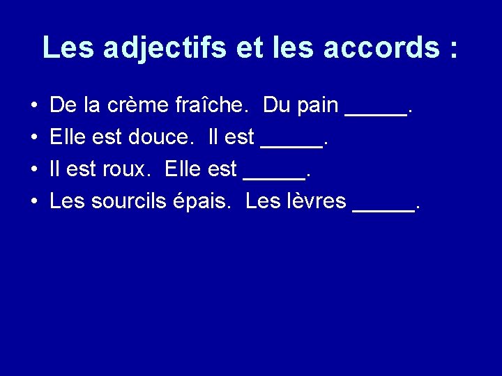 Les adjectifs et les accords : • • De la crème fraîche. Du pain _____. Elle est douce. Il est _____. Il est roux. Elle est _____. Les sourcils épais. Les lèvres _____.