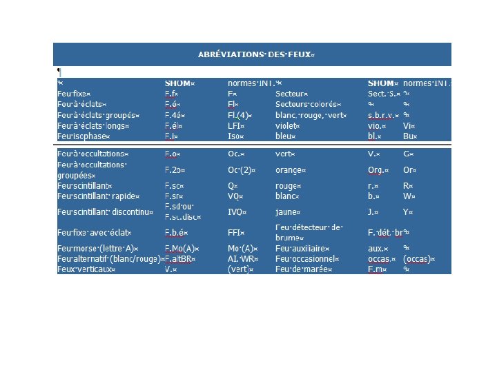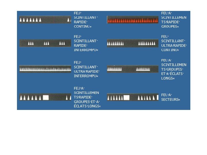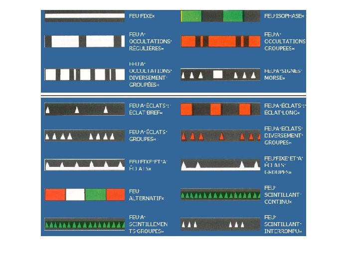 Les différents types de feux FEUX FIXES RYTHMES A OCCULTATIONS Lum > Obsc. ISOPHASES Lum = Obsc. A ECLATS Lum < Obsc. SCINTILLANTS Normal = 50 à 80 éclats / min. Rapide = 80 à 160 éclats/ min. Ultra rapide = au moins 160 éclats/ min. ALTERNATIFS Couleurs différentes alternées