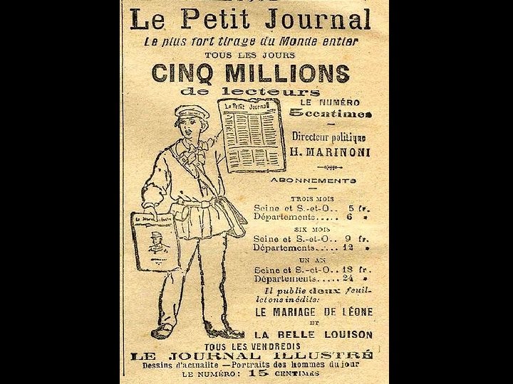 Le Petit Journal est un quotidien parisien, fondé par Moïse Polydore Millaud, qui a paru de 1863 à 1944. À la veille de la guerre de 1914 -18, c'est l'un des quatre plus grands quotidiens français d’avant-guerre, avec Le Petit Parisien, Le Matin, et Le Journal. Il tire à un million d'exemplaires en 1890, en pleine crise boulangiste. Le Petit Journal attire de nombreux lecteurs car il est bon marché (5 centimes au lieu de 15 centimes pour les journaux ordinaires), il a un format commode (43 × 30 cm), il est accessible à tous (pas d'abonnement), il propose un contenu distrayant (fait divers, feuilleton, horoscope et chronique), journal sans politique, il est dispensé du timbre même si une partie de son contenu est politique. Il est l'emblème d'une nouvelle forme de journalisme qui se développe, celle de la petite presse. Dès 1884, paraît l'hebdomadaire le Supplément illustré, dont le tirage atteint 1 million d'exemplaires en 1895. L'illustration couleur fut une innovation du Petit Journal. Le premier numéro sort le 1 er février 1863, et dès octobre, dépasse 83 000 exemplaires, il disparaît complètement en 1944