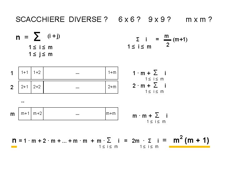 SCACCHIERE DIVERSE n = Σ (i + j) 2 x 2 (m = 2) = m 2 (m + 1) 1≤ i≤ m 1≤ j≤ m 1 2 2 3 3 4 1 2 m 2 (m + 1) 12 12