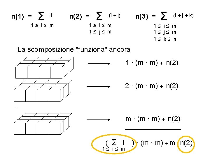 (i +. . . + i ) Σ 1≤ i ≤ m n(d) = 1 q d La scomposizione "funziona" ancora primo strato 1 · (m ·. . . ∙ m) + n(d-1) secondo strato 2 · (m ·. . . ∙ m) + n(d-1) . . . m · (m ·. . . ∙ m) + n(d-1) m-esimo strato n(d) = formula ricorsiva ( Σ i 1≤ i≤ m ) · (md ) + m · n(d-1)