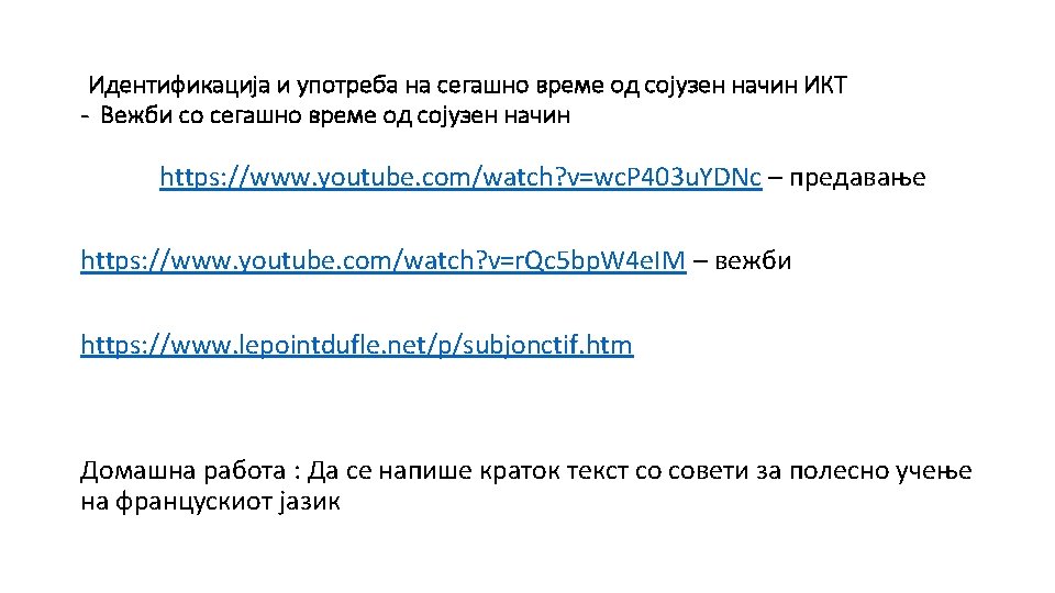“Le souhait, la volonté, le doute” - Изразување желба, волја, сомнеж Текст на стр. 86 од учебникот Вежби 1, 2, 3, 4 https: //www. podcastfrancaisfacile. com/cours/subjonctif-present-lecon-fle-emplois-subjonctif-present. html https: //www. bonjourdefrance. com/exercices/le-subjonctif-present-. html