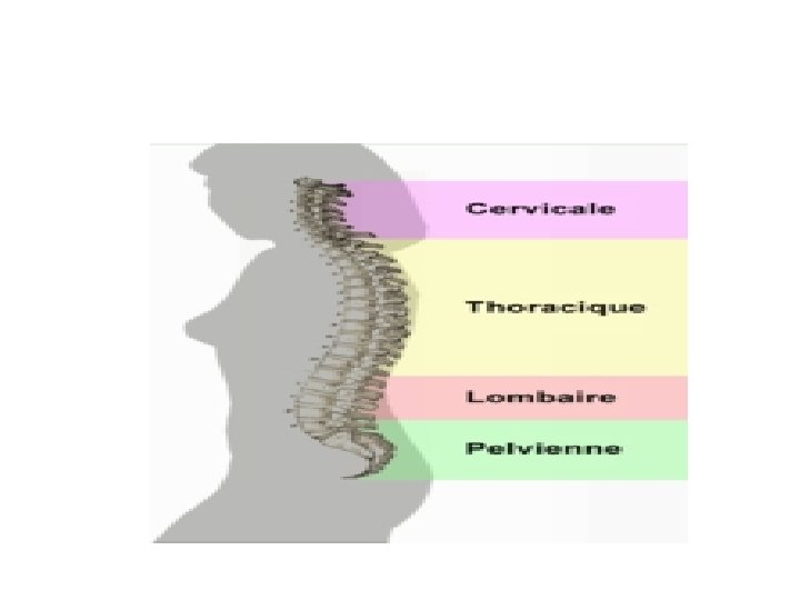 • La colonne vertébrale, ou rachis, est un empilement d'os articulés appelés vertèbres. Elle est le support du dos des vertébrés, notamment des mammifères. C'est sur la colonne vertébrale que sont fixées les côtes. Elle abrite la moelle épinière. • Chez l'Homme, elle supporte la tête et transmet le poids du corps jusqu'aux articulations de la hanche. • Elle est composée de 24 vertèbres (ou de 33 si on compte les vertèbres sacro-coccygiennes soudées) : sept vertèbres cervicales, douze thoraciques et cinq lombaires (plus cinq sacrées et quatre coccygiennes). • La colonne vertébrale est courbée dans le plan sagittal médian, selon un plan frontal. Elle présente deux courbures primaires (concaves en avant), aussi appelées cyphoses, au niveau des rachis thoracique et sacré, ainsi que deux courbes secondaires (concaves en arrière) appelées lordoses au niveau des rachis cervical et lombaire.