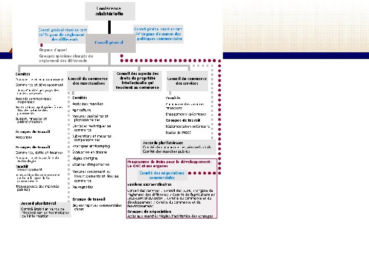 La structure de l’OMC (5) • Les organes subsidiaires du Conseil du commerce des services s'occupent des services financiers, de la réglementation intérieure, des règles de l'AGCS et des engagements spécifiques. • Au niveau du Conseil général, l’Organe de règlement des différends a aussi des organes subsidiaires: d’une part, les “groupes spéciaux” chargés du règlement des différends, qui sont composés d’experts et ont pour mission de statuer sur les différends non réglés et, d’autre part, l’Organe d’appel qui connaît des appels.