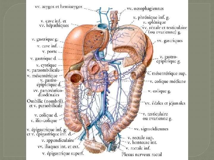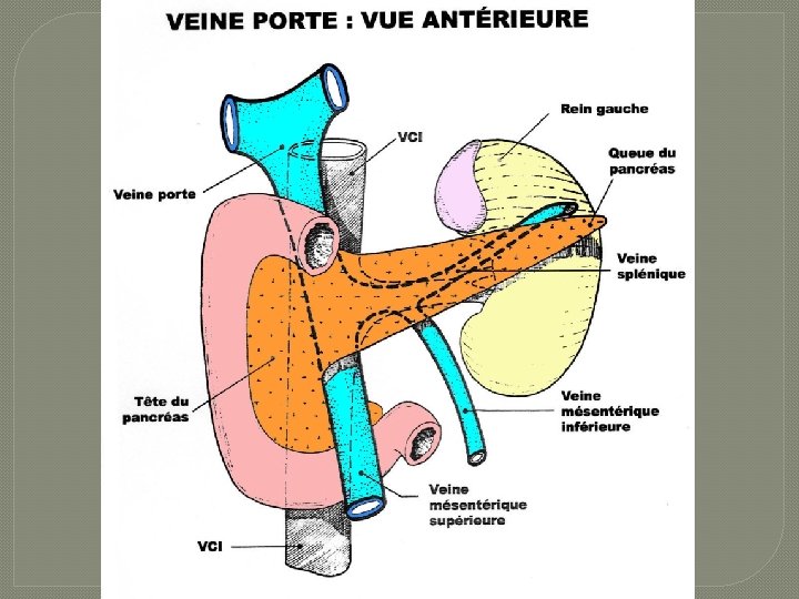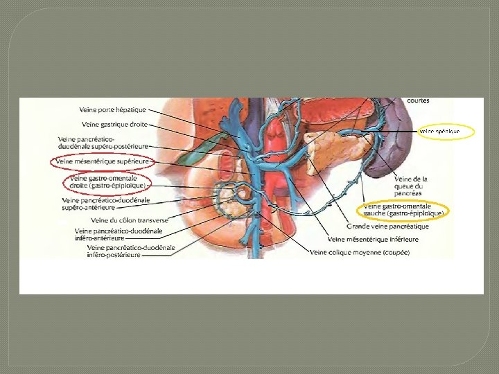 suite � Terminaison : �Derrière le col du pancréas en recevant à angle droit le tronc spléno-mésentérique (ou tronc spléno-masaraïque). � Collatérales : �Elle reçoit les veines intestinales, les veines iléale, la viens caecale, la veine appendiculaire, la veine colique moyenne droite et la veines gastroépiploïque.