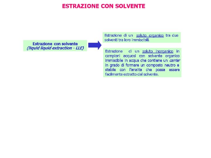Separazione di Anioni es. Cl-, NO 3 - e SO 42 - La configurazione dello strumento è: colonna con resine ammonio quaternario in forma HCO 3 -; soppressore in forma H+; rivelatore conduttimetrico. Gli analiti in esame sono dissociati a qualsiasi p. H quindi scegliamo come eluente una miscela Na 2 CO 3/Na. HCO 3 Nella colonna gli anioni si separano ed escono a diversi tempi in forma Na+ (Na+Cl-, …) insieme ad un largo eccesso di Na+HCO 3 - e Na+2 CO 32 - Tutti gli analiti, trasformati in acidi forti, (H+Cl-, …) danno un segnale mentre l’eluente, ora H 2 CO 3 poco dissociato, non viene rivelato Nel soppressore il catione coordinato (Na+) viene sostituito da H+.