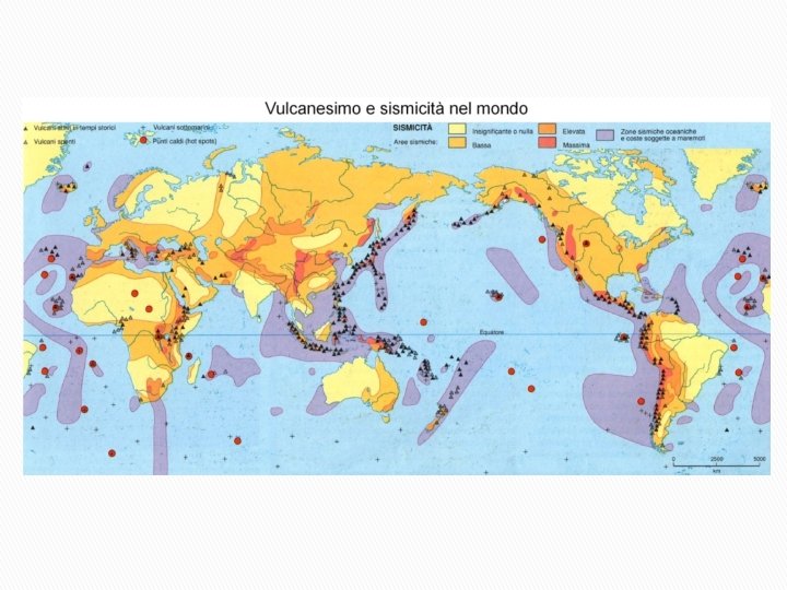 VULCANI E TERREMOTI � Conseguenze dei movimenti delle zolle: - Orogenesi (= formazione delle montagne) - Eruzioni vulcaniche - Sismi (= terremoti) � Vulcani: spesso lungo i margini delle zolle, soprattutto nel Pacifico (“cintura di fuoco”). Alcuni sono sottomarini, altri formano isole (es. Hawaii) � Terremoti: causati dalle onde sismiche. Hanno origine nell’ipocentro, che si trova in profondità. Il corrispondente punto in superficie è l’epicentro. L’intensità si misura con la scala Mercalli (considera gli effetti provocati) o con la scala Richter (considera l’energia liberata dal sisma)