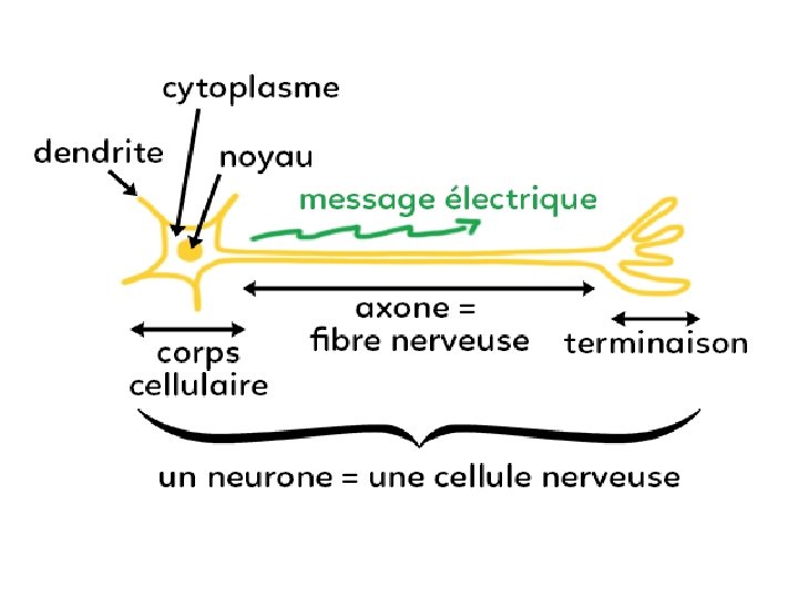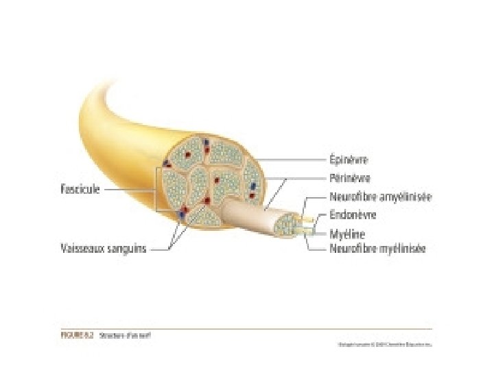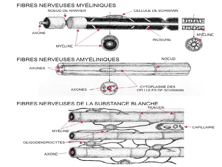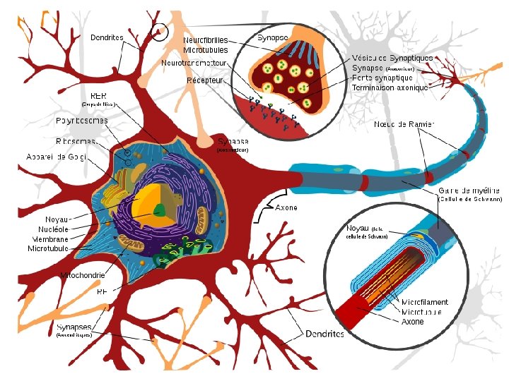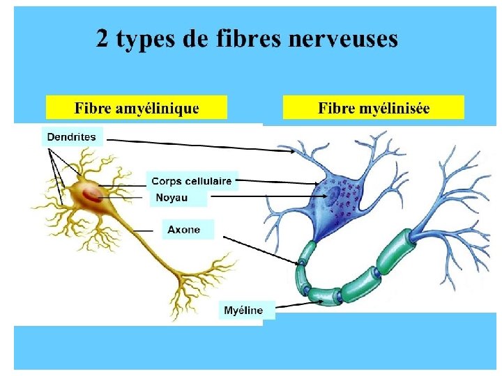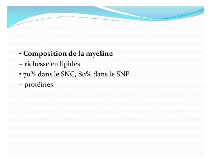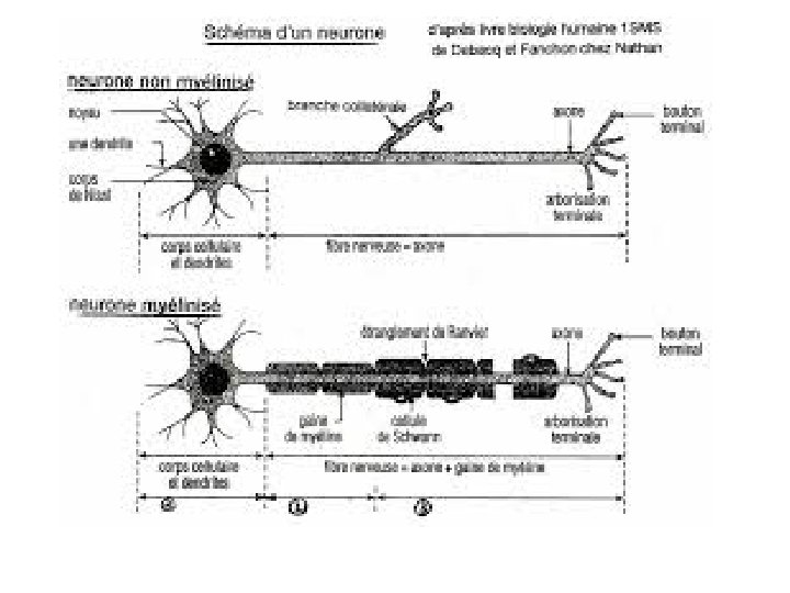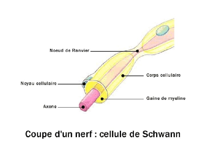 Gaine de myéline • Les axones longs sont recouverts d’une enveloppe blanchâtre, lipidique et segmentée appelée gaine de myéline. • La myéline protège les axones et les isole électriquement les uns des autres. • Elle accroît la vitesse de transmission des influx nerveux. • L’axone amyélinisé achemine les influx nerveux très lentement.