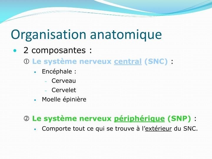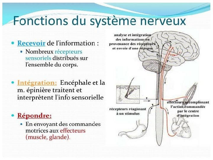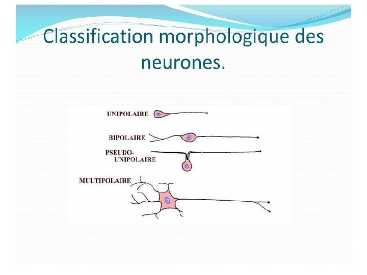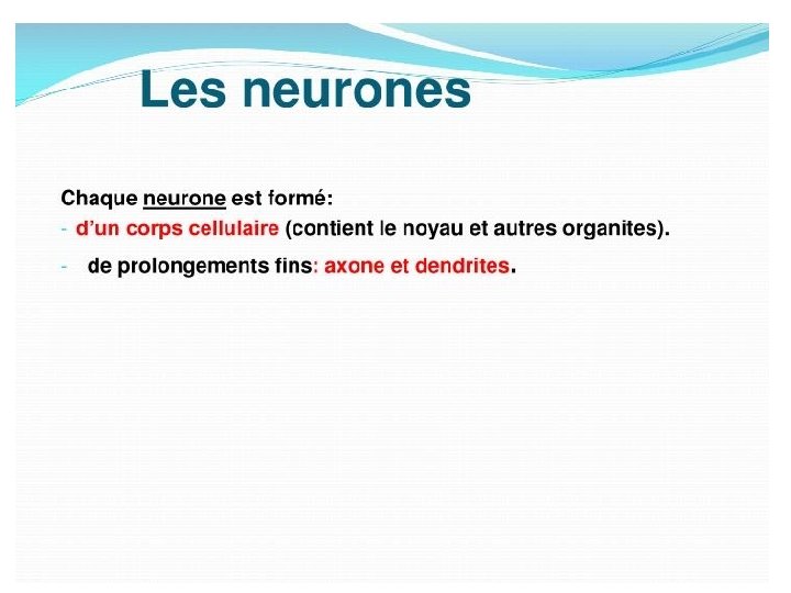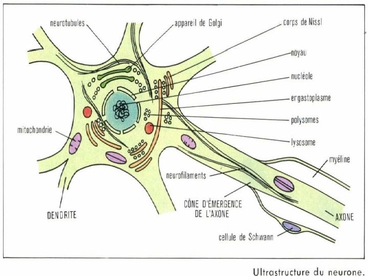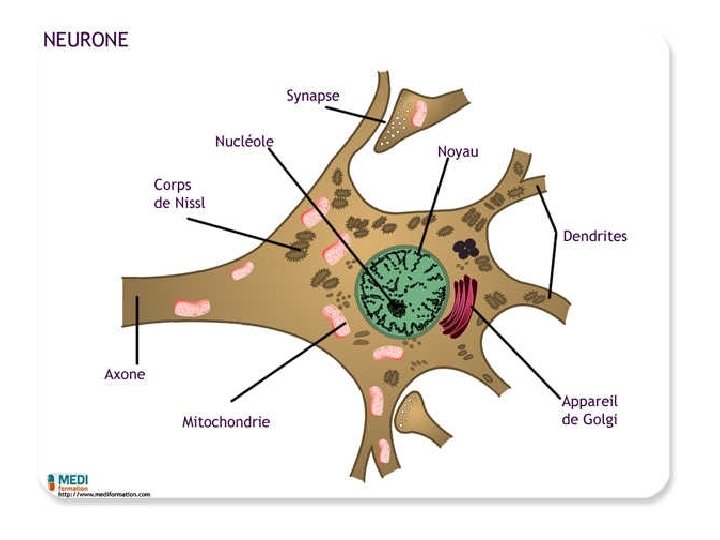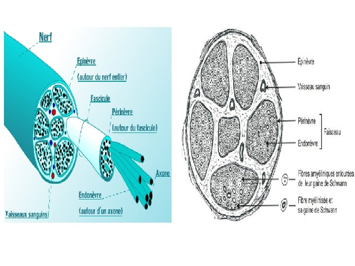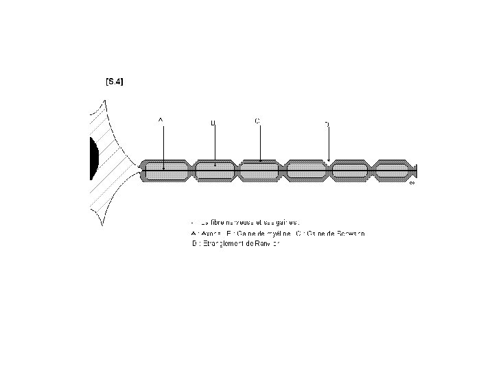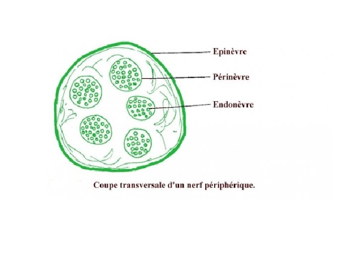 Gaine de myéline • Les axones longs sont recouverts d’une enveloppe blanchâtre, lipidique et segmentée appelée gaine de myéline. • La myéline protège les axones et les isole électriquement les uns des autres. • Elle accroît la vitesse de transmission des influx nerveux. • L’axone amyélinisé achemine les influx nerveux très lentement.
