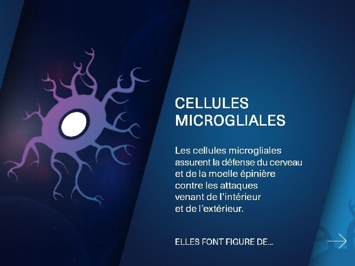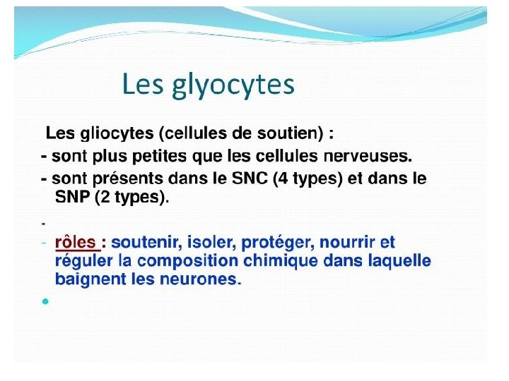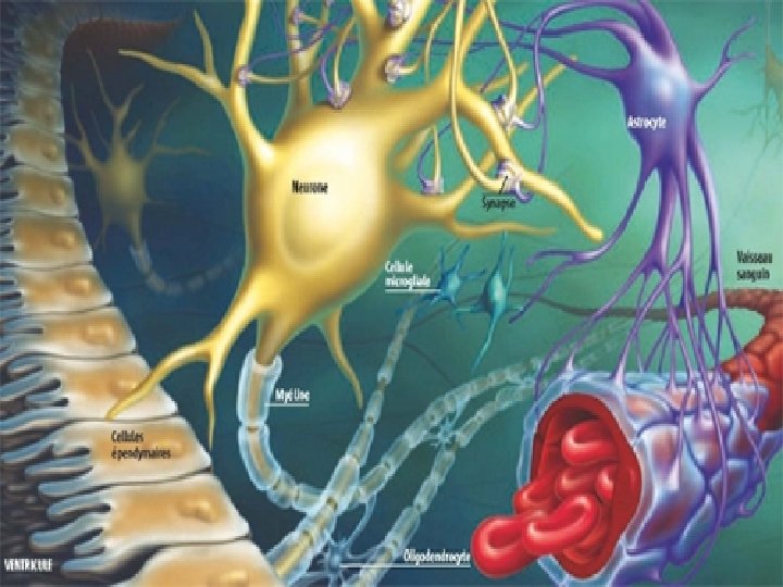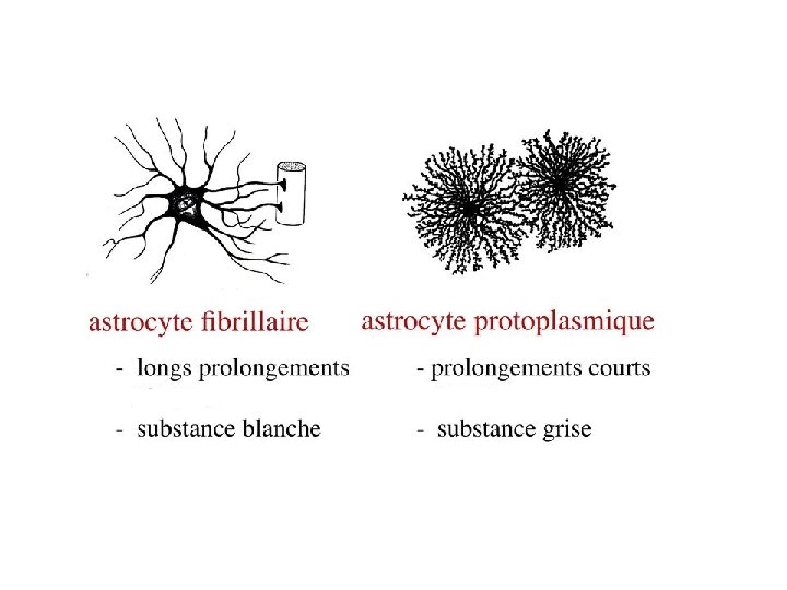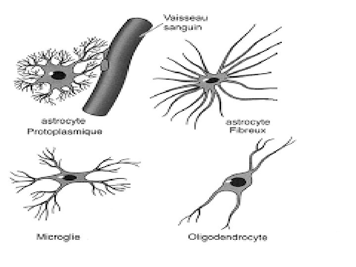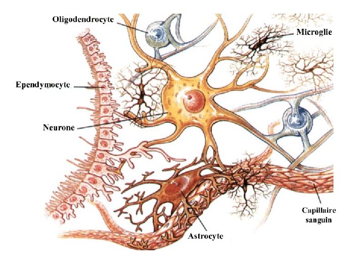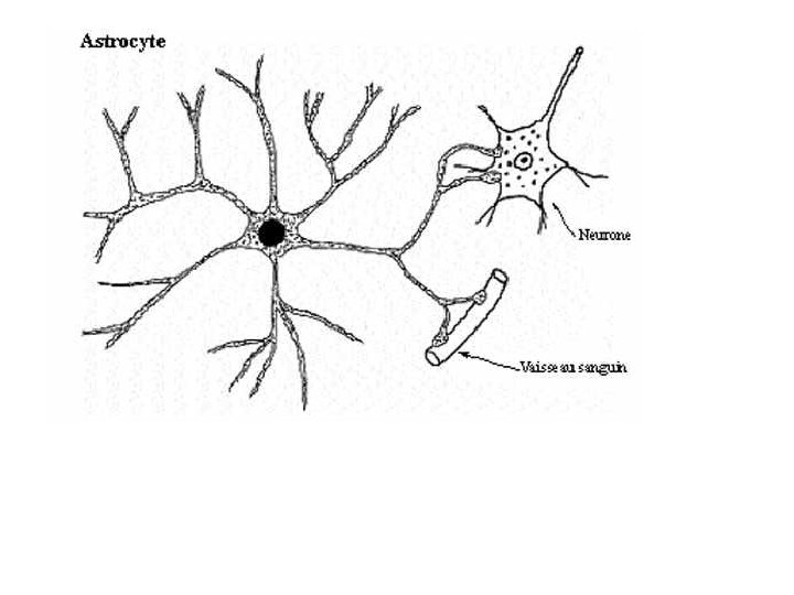 Astrocyte - Ancrer les neurones sur les capillaires sanguins - Filtrer le sang qui passe aux neurones - Réguler les concentrations extracellulaires d’ions et de neurotransmetteurs