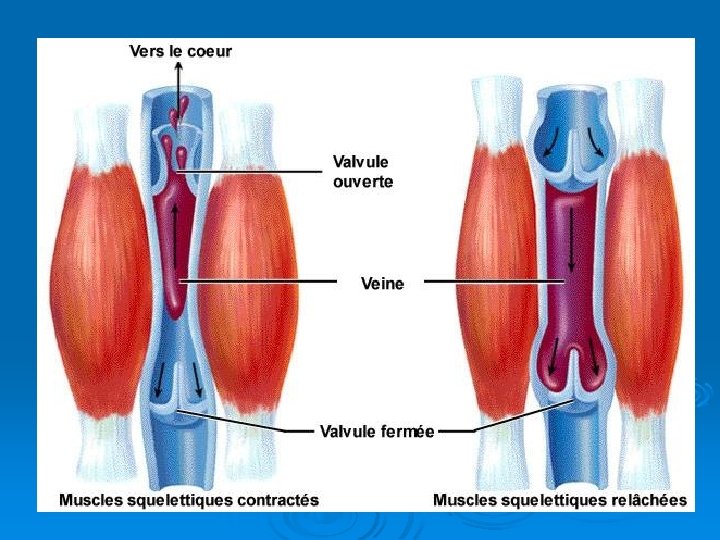 VEINES: Mécanisme nécessaire pour ramener le sang au cœur. Au dessus du cœur: la gravité contribue Au dessous du cœur: • Le sang doit être poussé contre la gravité. • Une pression musculaire non rythmique est exercée sur les vaisseaux logés entre les muscles, surtout lorsque le corps se déplace. • Les veines ne se contractent pas, mais elles sont menues de valves anti-reflux.