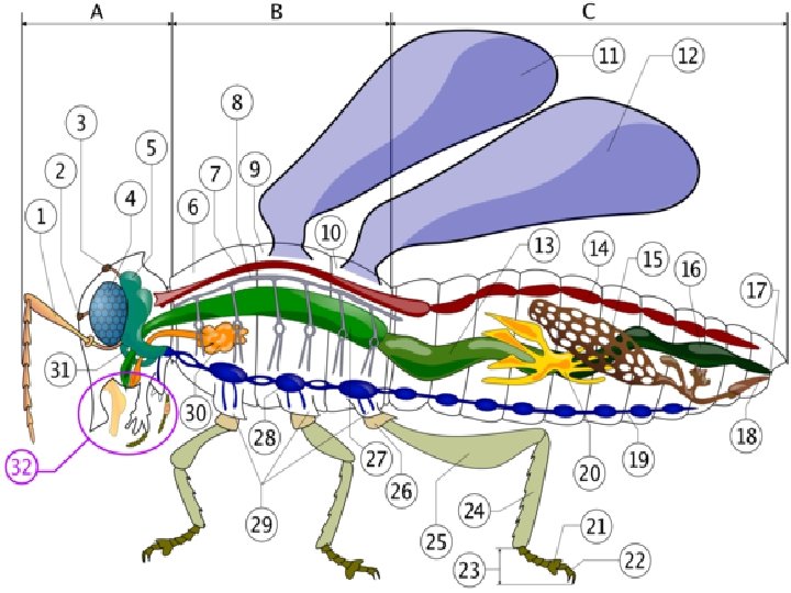 • • • Tête A Thorax B Abdomen C Cœur 14 Aorte 7 Cerveau 5 Cordon nerveux 19 Estomac 13 Intestin 16 Anus 17 Pièces buccales 32 Trachées 8
