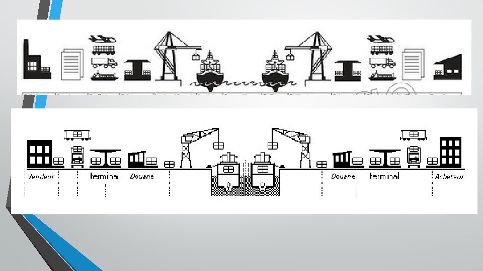 Les transports terrestres • • • Les transports routiers de messagerie hérités de la Poste puis des chemins de fer et concernant des envois de quelques kilos (ou moins) à environ moins de 3 tonnes Toute une gamme de services différents (voir infra) de la simple lettre à la " messagerie Express ". Les transports routiers de " colis" du type " messagerie rapide ". (integrateurs) Les transports routiers de " lots directs " de plus de 3 tonnes Les transports routiers de camions complets. Le ferroutage, pratique consistant à transporter sur un wagon de chemin de fer un camion ou une remorque par exemple pour leur faire traverser un tunnel (ex : tunnel sous la Manche) ou un pays (ex : la Suisse), etc. Le transport combiné associant successivement plusieurs modes de transport par exemple pour le transport de conteneurs. Le transport par chemin de fer par colis, ou par wagons complets ou par trains complets. Le transport par voie fluviale. Le transport par pipe line ne doit pas être oublié : il permet de transporter des quantités très importantes à un coût faible.
