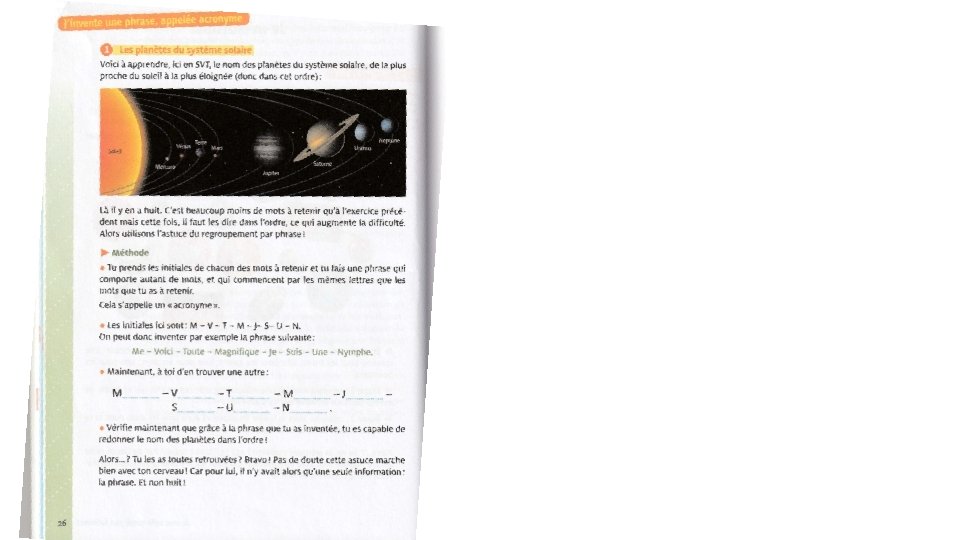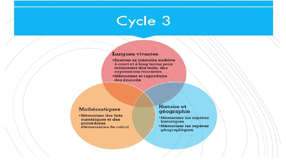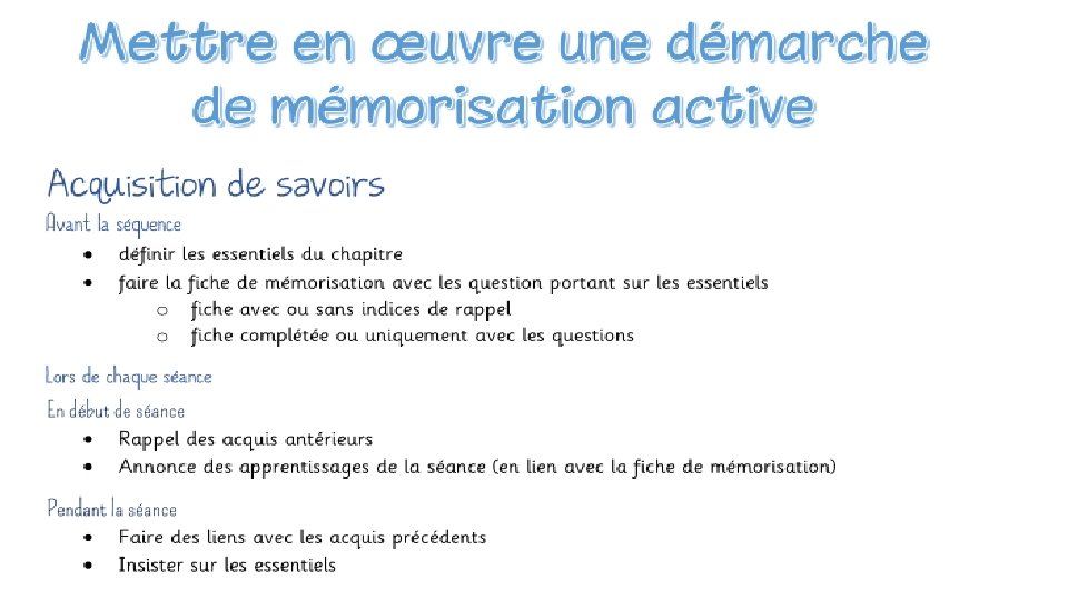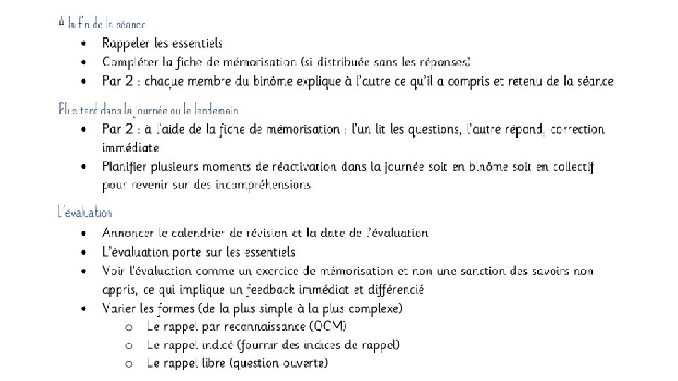 Autres astuces à donner aux élève pour se souvenir longtemps: 1/ Refaire les exercices déjà faits en classe: aller retour entre mémoire de travail et mémoire à long terme 2/ Faire une feuille de suivi de mes connaissances (chaque jour: noter les matières vues et qq mots clés dessous ) 3/ Réviser efficacement : revoir la leçon dans les 24 h, puis une semaine après, puis un mois après = l’info sera mémorisée dans la mémoire à long terme 4/ Bien dormir (8 à 9 h) en aérant sa chambre (le cerveau a besoin d’oxygène) et sans écrans!