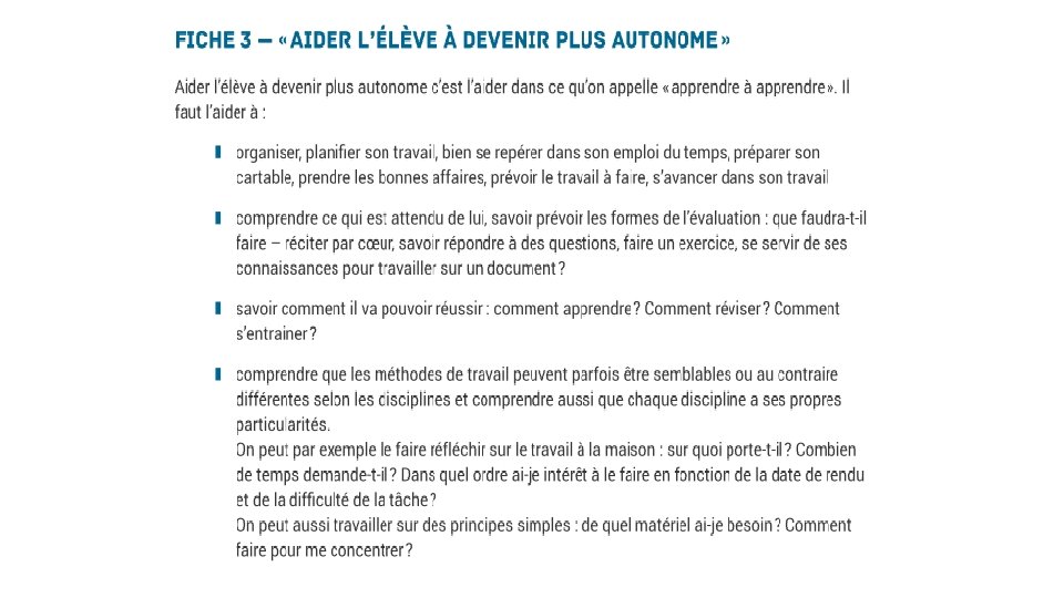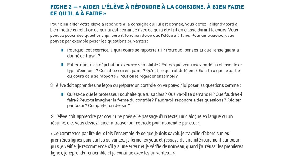 D’après le chercheurs, les effets bénéfiques devoirs ne sont possibles qu’à certaines conditions: 1/ Se doter de règles claires et explicites concernant les devoirs: Ces règles serviraient à définir clairement les raisons pour lesquelles on donne des travaux à réaliser à la maison, à spécifier le temps qui devrait leur être consacré ainsi qu’à préciser le rôle des enseignants et des parents dans la réalisation des devoirs. 2/ Soutenir les parents Certaines écoles proposent aux parents un petit guide afin de les aider à organiser les devoirs à la maison. D’autres offrent des ateliers afin de former les parents à soutenir leurs enfants adéquatement dans la réalisation des devoirs. 3/ 3/Privilégier la fréquence à la longueur Comme on l’a vu, plusieurs chercheurs ont trouvé que la fréquence des devoirs possède un impact plus positif que la longueur. Au primaire et en début d’année surtout, il est préférable de donner des devoirs courts, susceptibles d’être réussis par tous et qui laissent aux élèves du temps pour les loisirs et le repos. Au secondaire, il convient d’augmenter la difficulté et la longueur des devoirs, mais de le faire graduellement afin de ne pas démotiver les élèves ( 4/ Donner des devoirs qui ont du sens Les devoirs devraient être l’occasion d’apprendre autrement et devraient avoir une nature ludique, du moins au primaire. Corno (2000) suggère qu’au lieu d’apporter l’école à la maison, les devoirs devraient plutôt être l’occasion d’apporter la maison à l’école. Cela signifie que les devoirs pourraient consister à demander aux élèves d’appliquer les connaissances acquises à l’école à leur environnement familial et à leur vie de tous les jours. 5/Particulariser les devoirs, offrir des choix Tous les élèves de la même classe ne sont pas obligés d’avoir toujours les mêmes devoirs. Alleman et Brophy (1991) suggèrent, par exemple, d’offrir des options, c’est-à-dire de proposer aux élèves de choisir leurs devoirs parmi une liste de tâches en fonction de leurs compétences et de leurs intérêts. 6/ Établir des routines en relation avec les devoirs