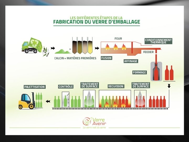 Recuisson, contrôle et emballage • Le verre est ensuite chauffé à nouveau dans une arche de recuisson (solidité) • Traitements de surface à chaud et à froid (rayures) • Contrôle de qualité par faisceaux lumineux et inspection manuelle • Empaquetage • Expédition